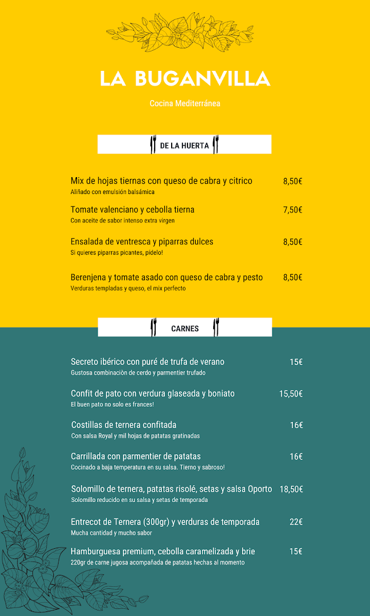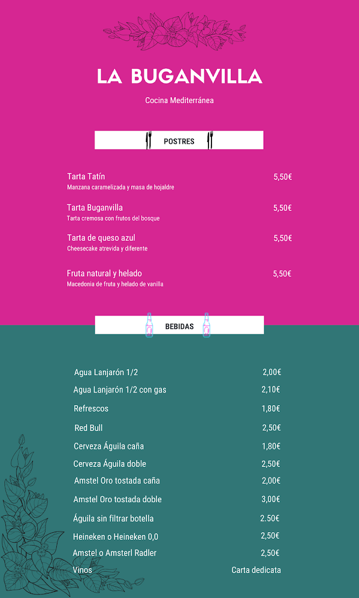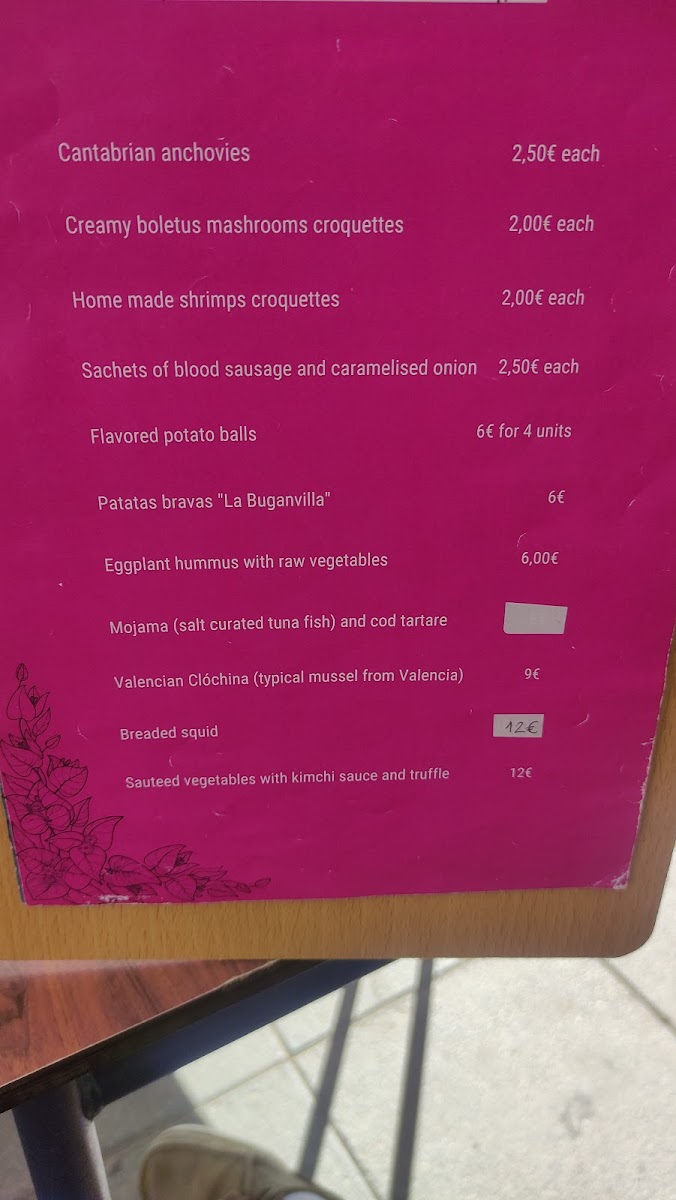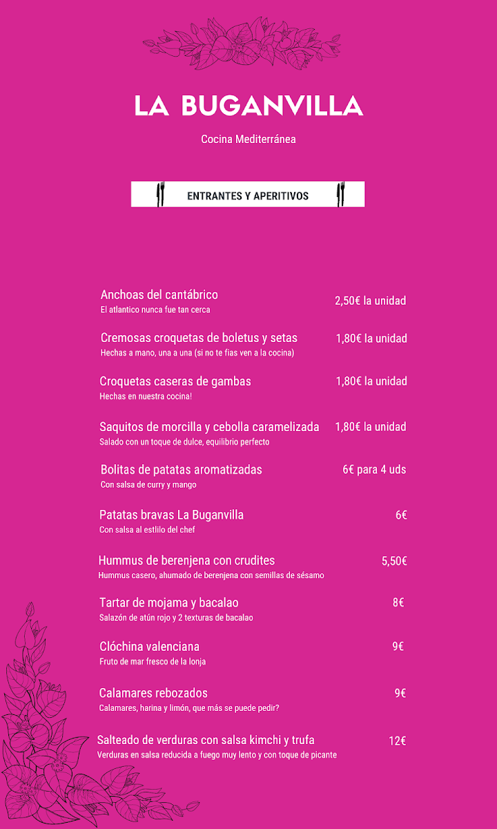 Viewed through a reviewer’s lens, the menu at La Buganvilla in Poblats Marítims feels thoughtfully curated, balancing comfort classics with creative, Mediterranean-forward plates. Desserts set a confident tone, from the house-signature Tarta Buganvilla to the rich Tarta de Queso Azul and the comforting Tarta de Manzana, each offering a distinct finale that complements the savory lineup. The mains showcase depth and variety: Secreto Ibérico and Solomillo deliver robust, meat-forward satisfaction, while Duck and Pato Confitado highlight careful technique and indulgent textures. Seafood is equally well represented, with Tataki de Atún, Chipirones, and Tartar de Bacalao Con Mojama bringing freshness and finesse to the table. For those seeking approachable favorites, the Burger and Patatas Bravas provide familiar comfort, elevated by quality ingredients and execution. Small plates and starters round out the experience with personality-Croquetas de Rabo de Toro and Croquetas Gambas Y Bolutus are crowd-pleasers, Saquitos de Morcilla add a hearty bite, while Humus de Berenjena and Salteado de Verduras Con Kimchi introduce lighter, contemporary contrasts. Simple touches like Pan support the meal without distraction, and thoughtful pairings such as a Copa de Vino enhance the flavors across courses. The experience closes naturally with Café, reinforcing the sense of a complete, well-paced menu that prioritizes balance, variety, and satisfaction without excess.